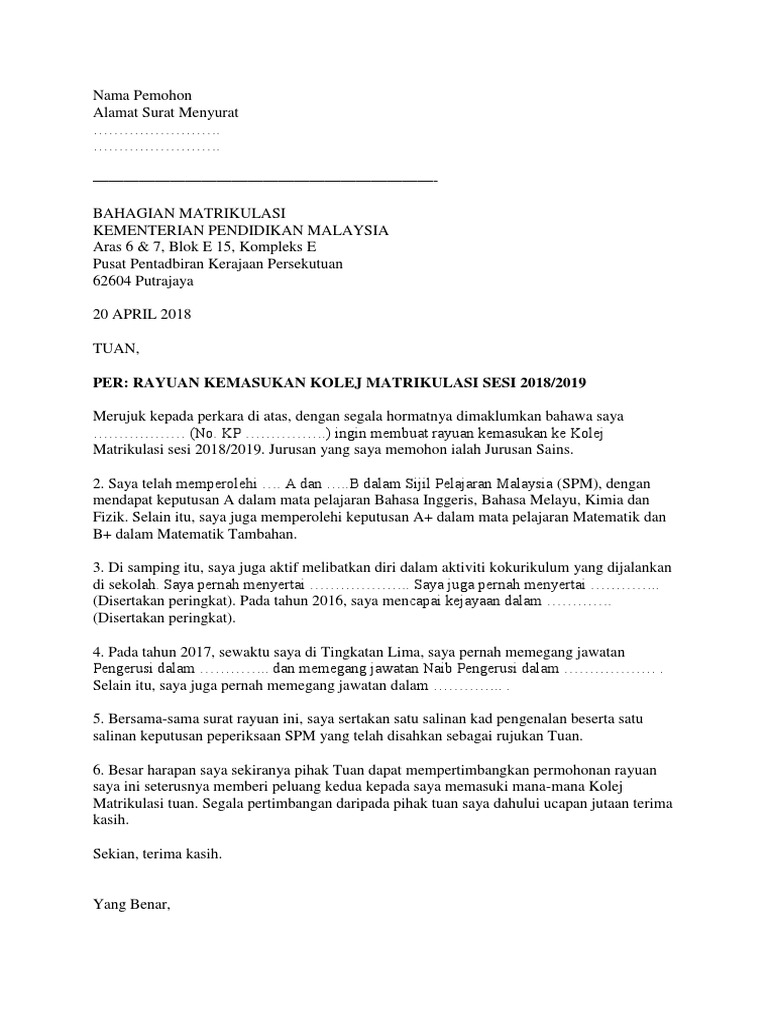 Contoh Surat Rayuan Kemasukan Ke Kolej Matrikulasi Melalui Online Bertulis Pdf